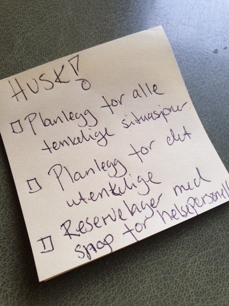 Listen er ikke fullstendig, for jeg er ingen ekspert på beredskap. Jeg er bare en helt ordinær anestesisykepleier (med 15 studiepoeng i folkehelsevitenskap). Hjelp meg gjerne med forslag til nye punkter.