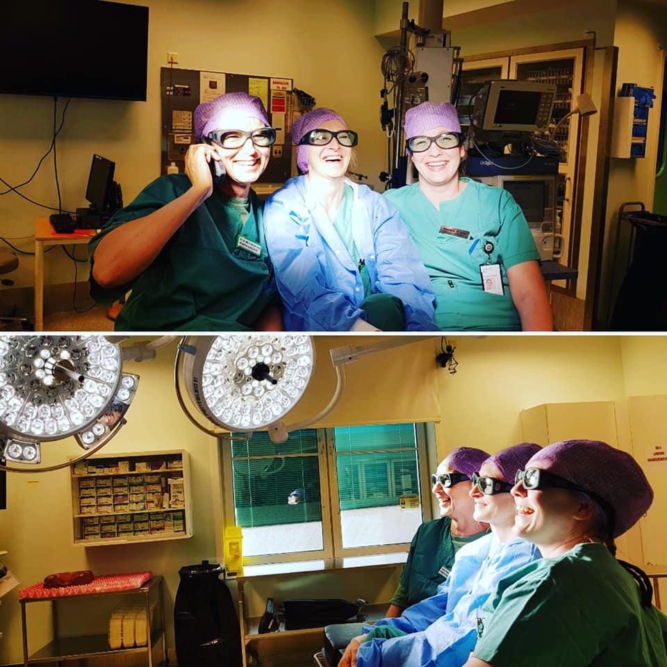 Bilder fra en jobb-påske. Det var legendarisk fint vær, og vi var en gjeng som ikke kunne nyte det, vi var i stedet «fanget» i operasjonsavdelingen. Da gjelder det å gjøre det beste ut av det. Mens vi ventet på neste pasient lagde vi våre egne påskebilder i operasjonslampe-solen. «Solbrillene» er laserbeskyttelse-briller.
