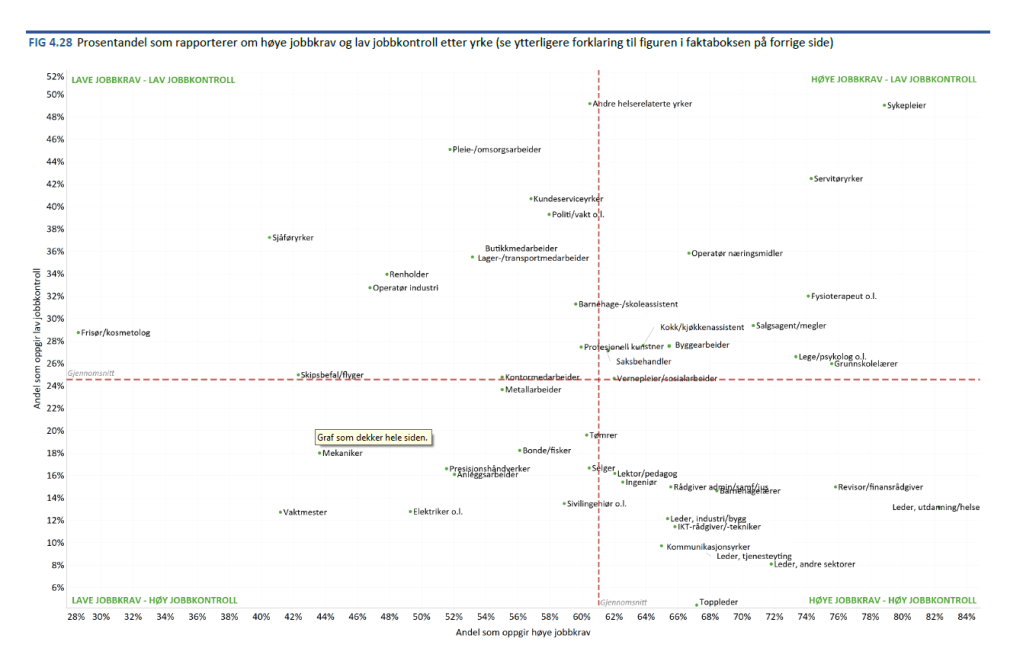 Figur fra Faktabok om arbeidsmiljø og helse 2021, utgitt av STAMI. Oversikt over forholdet mellom krav og kontroll i ulike yrker.